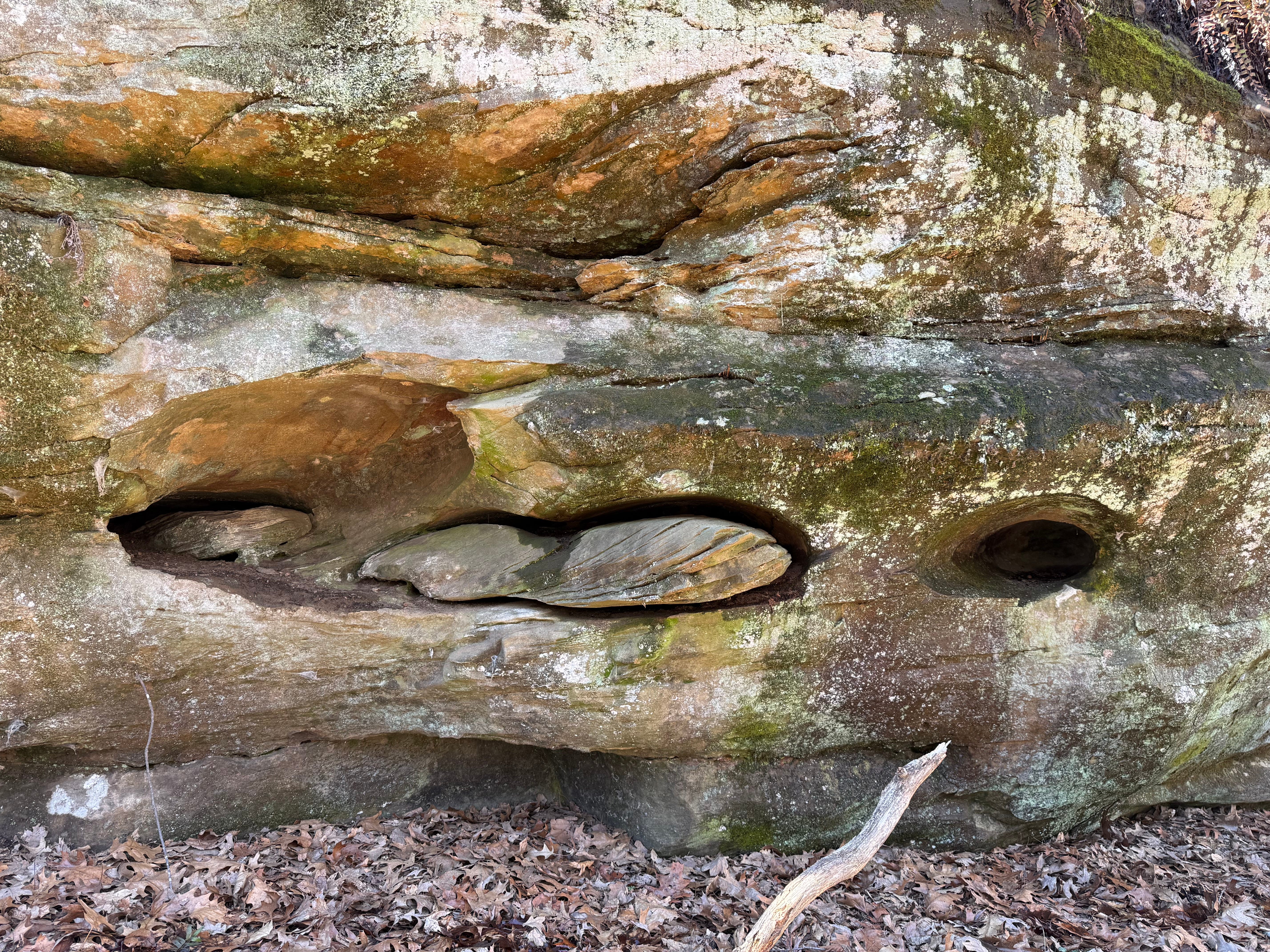 The area we visited is not large in acreage but is vastly unique in topography and history. The terrain of the deepest rock tells that there was a river valley (300 odd million years ago) that filled with sediment, leaving behind a mostly sandstone river bed. Compressed by time and eroded over the millenia, we find today’s sculpted low-canyon walls that seep moisture to resident bryophytes and pterophytes (and so much more flowering life will become visible there in coming weeks.)