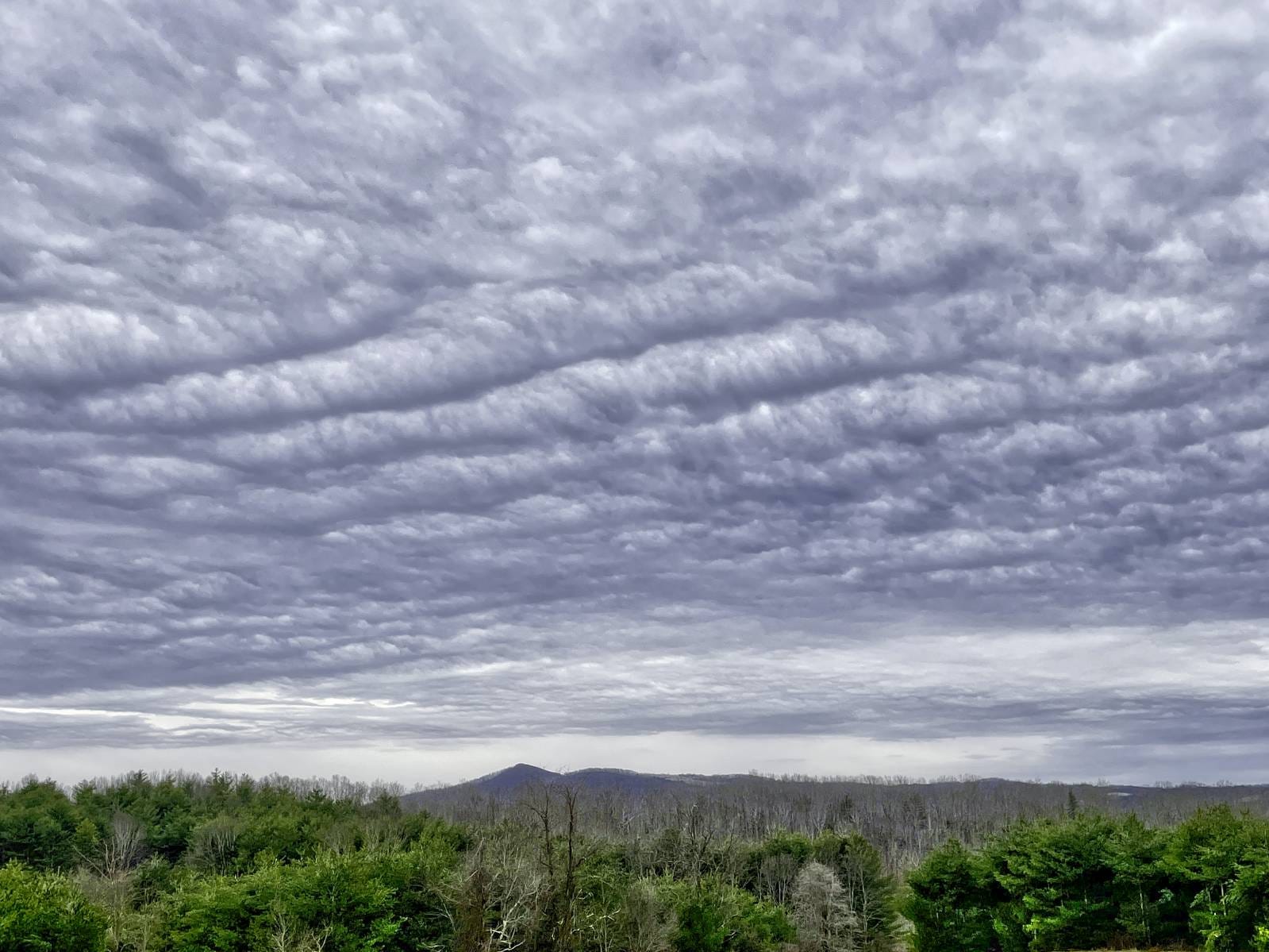 It was a red fox—the first we’ve seen here. And I probably would not have noticed it had I not already been pleasantly distracted by the shifting clouds out that same window, on this cold-but-calm before the storm. The mid-level clouds are banded with regular corrugations perpendicular to the direction of the winds, the winds in advance of an approaching weather system—from the northwest.